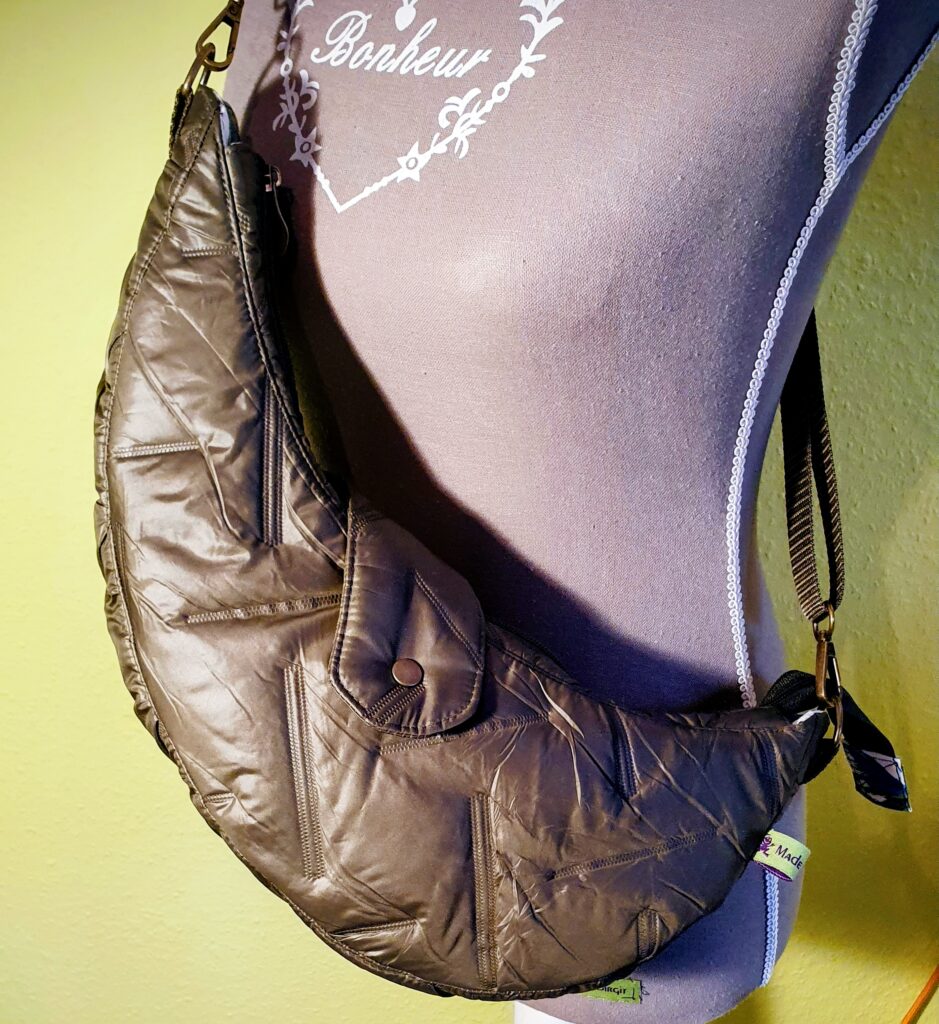 Bauchtasche aus Steppstoff und trendigem Gurtband. Gefüttert mit Baumwolle.