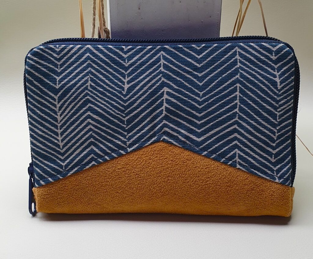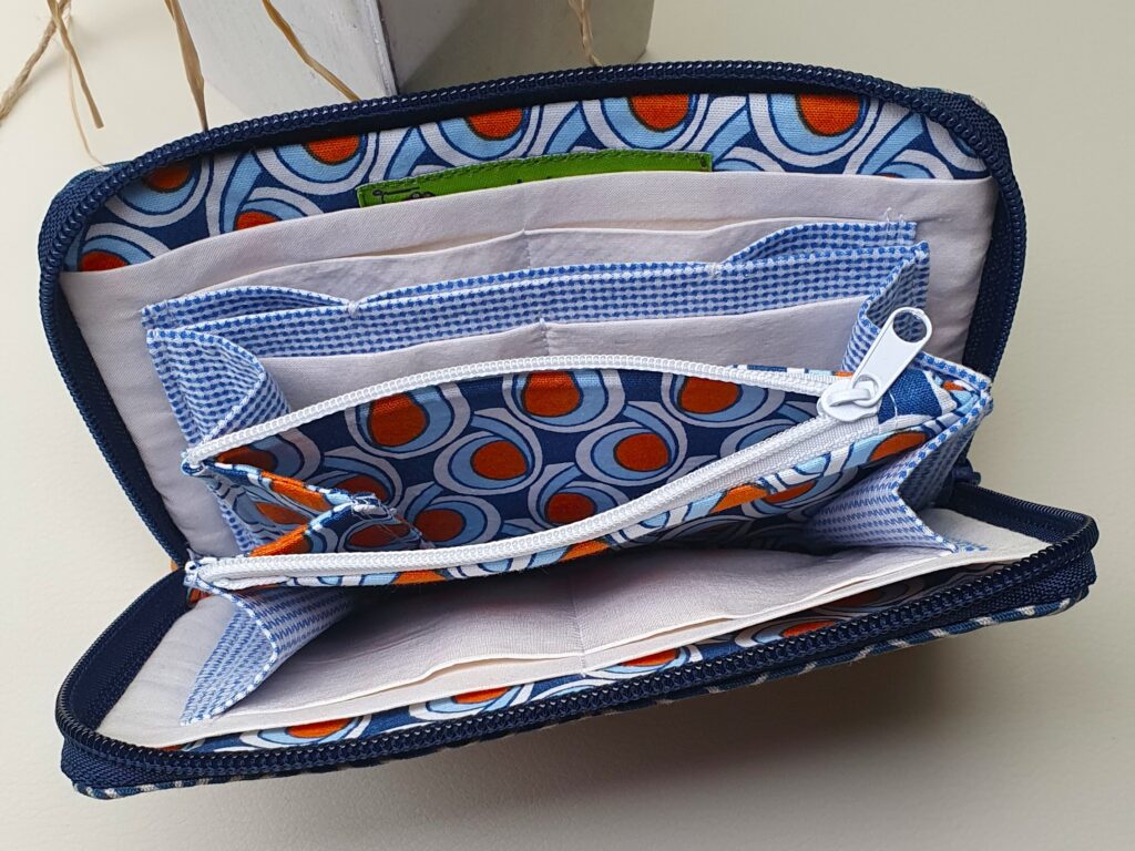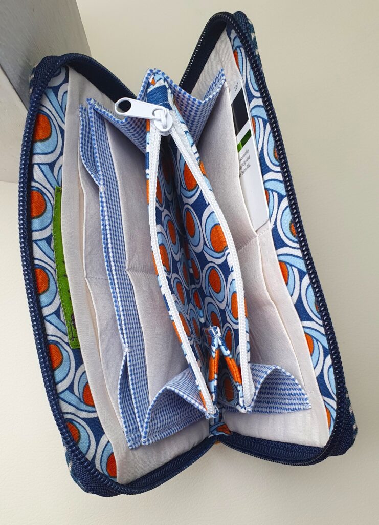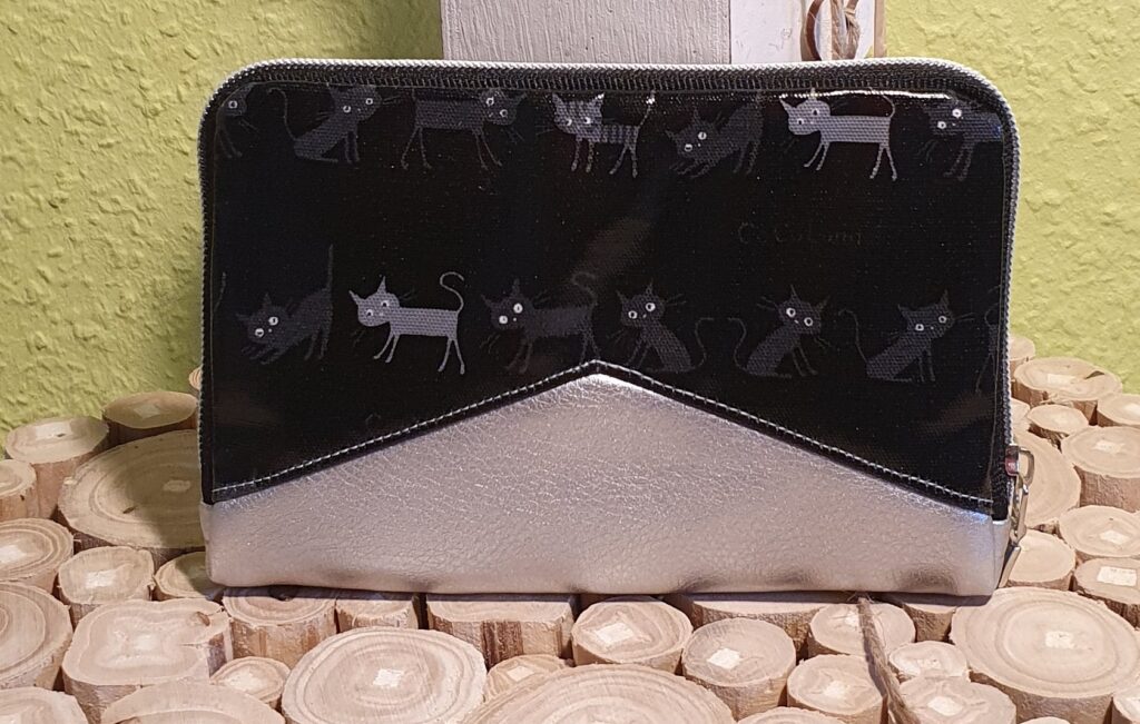 Portemonnaie aus verschiedenen Materialien: Wachstuch, Canvas und Kunstleder mit umlaufendem Reißverschluß. Innen mit 9 Kartenfächern, einem weit zu öffnendem Münzfach mit Reißverschluß und 1 Einsteckfach für Geldscheine.