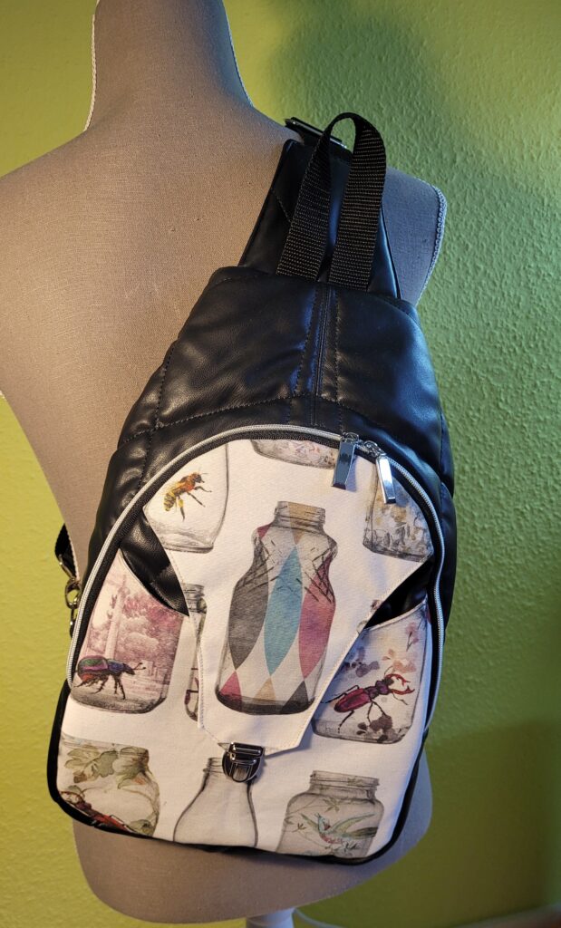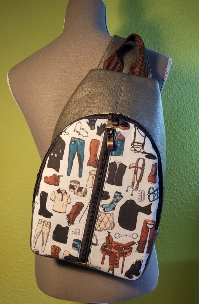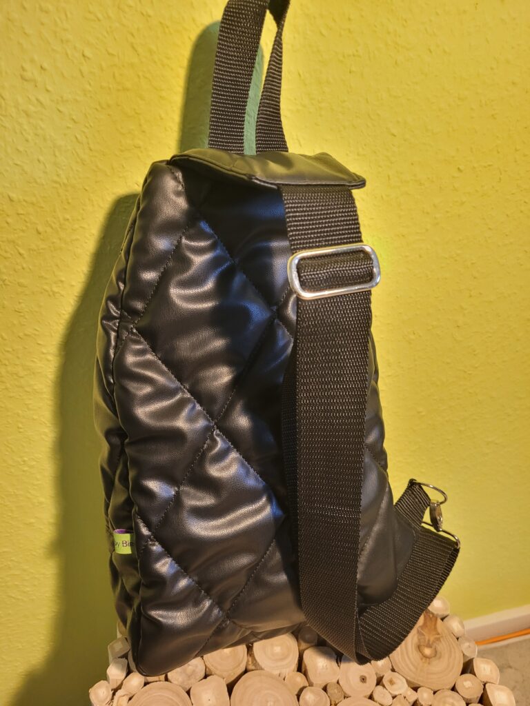 Dieser Rucksack oder Sling Bag, den man cross over trägt, hat ein dekoratives Außenfach mit Reißverschluss. Oben wird der Rucksack mit einem Zwei-Wege-Reißverschluss geschlossen. Innen könnt Ihr in einem Doppelsteckfach und einem weiteren Reißverschlussfach Eure Sachen unterbringen.